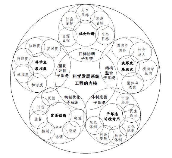 第三部分是科学发展系统工程的子系统研究。科学发展系统工程由五个子系统,即目标协调、结构整合、量化评估、体制完善、机制优化组成,各系统之间是相互衔接、相互促进、相互制约、互为条件的,从而构成一个有序运行的统一体。