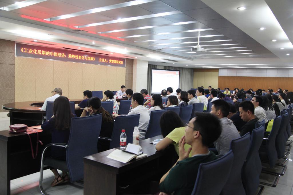 报告会上,黄所长从中国经济发展新阶段、经济增速放缓的趋势与经济失速风险、 经济服务化趋势与制造业空心化风险、去产能化趋势与经济债务风险、两化融合趋势与新工业革命风险、供给要素集约化趋势与要素市场改革滞后风险和价值链攀升趋势与两端挤压风险等方面,结合CPI和PPI等数据指标清晰而生动诠释了经济新常态就是工业化,并从我国的工业化基本特征、中国工业化未来20年发展面临的问题,就内生变量和外生变量等角度作了详细的解读,对中国工业化后期经济增长率的减速作了相应解释。他强调,实现工业化并不意味着工业化时代的终结,对于刚刚步入工业化后期的中国而言,其工业化进程还远未结束,制造业的重要地位并未改变。在十三五的产业发展中,移动互联网、云计算技术等12种颠覆性技术将带给我们超乎想象的未来。