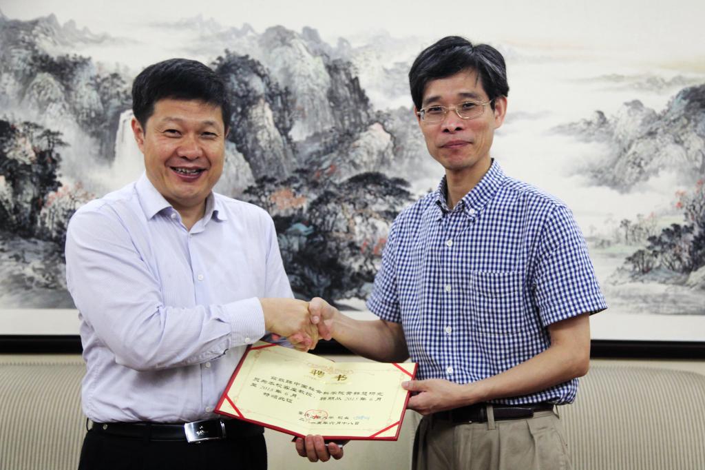 会前,孙芳城校长、孟东方副书记、何勇平副校长会见了黄群慧所长,孙芳城校长为其颁发了客座教授聘书。